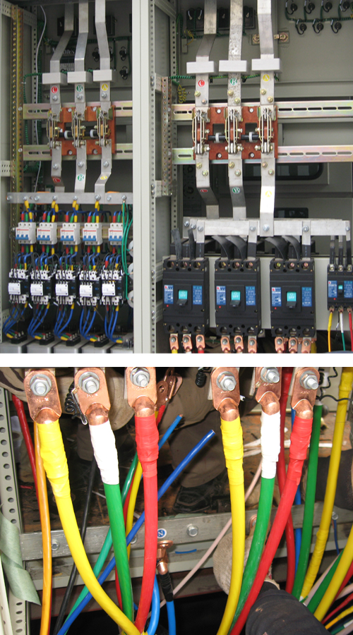 電氣控制柜主要由金屬柜體、開關(guān)設(shè)備、繼電裝置、信號裝置、測量儀表、保護(hù)電器和輔助設(shè)備組成,構(gòu)成低壓配電裝置。正常運(yùn)行時可借助手動或自動開關(guān)接通或分?jǐn)嚯娐贰9收匣虿徽_\(yùn)行時借助保護(hù)電器切斷電路或報警.借測量儀表可顯示運(yùn)行中的各種參數(shù),還可對某些電氣參數(shù)進(jìn)行調(diào)整,對偏離正常工作狀態(tài)進(jìn)行提示或發(fā)出信號。